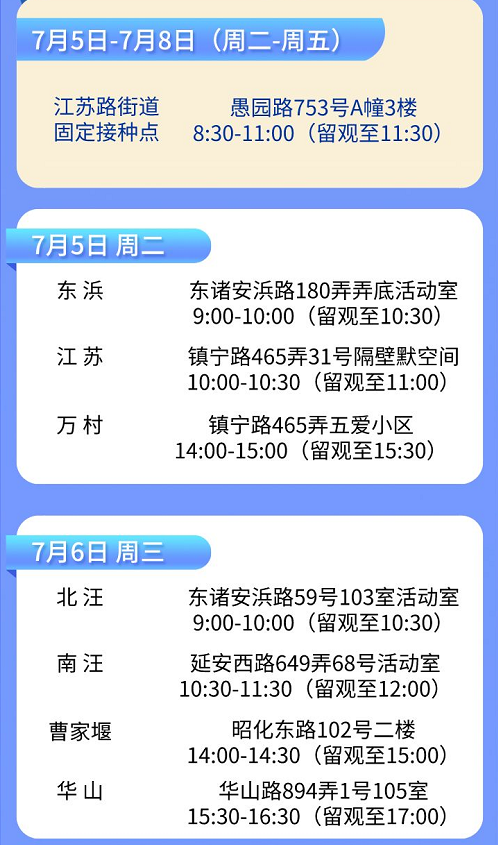7月5日至7月8日江苏路街道近期疫苗接种安排