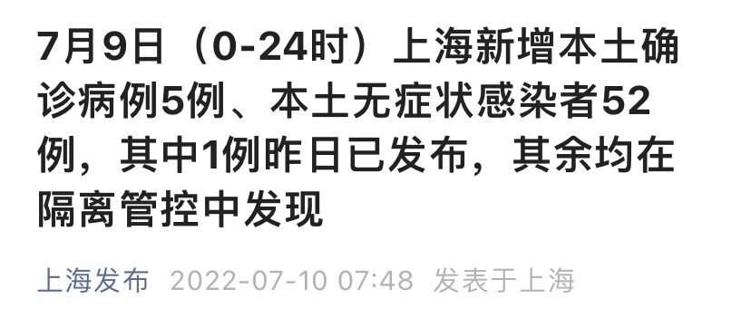上海市卫健委7月10日通报:2022年7月9日0—24时,新增本土新冠肺炎确诊病例5例和无症状感染者52例,其中4例确诊病例和52例无症状感染者在隔离管控中发现,1例确诊在风险人群筛查中发现,详情如下。