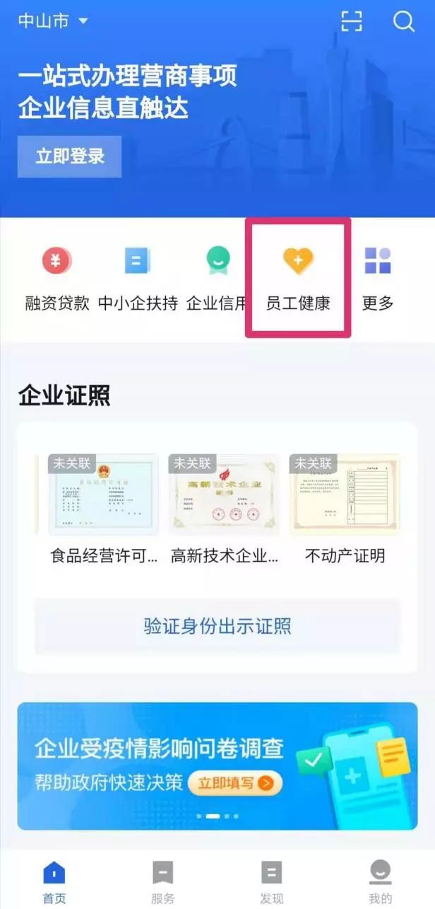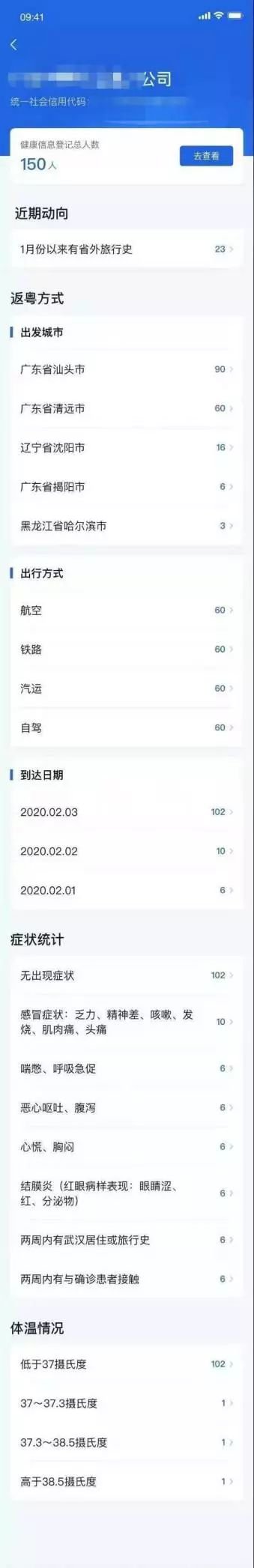 法定代表人打开粤商通首页【员工健康】,查看员工健康统计结果,往下滑动查询全部数据。