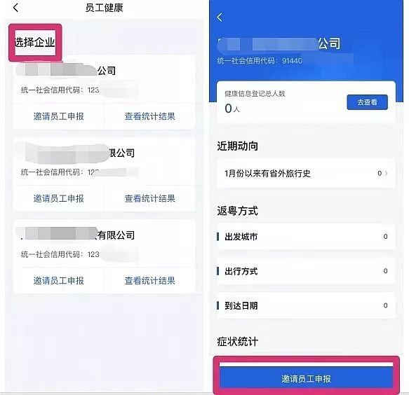 ①在健康统计详情页点击【邀请员工申报】,如果该企业法人有多家企业,可直接在企业列表中点击邀请员工申报。