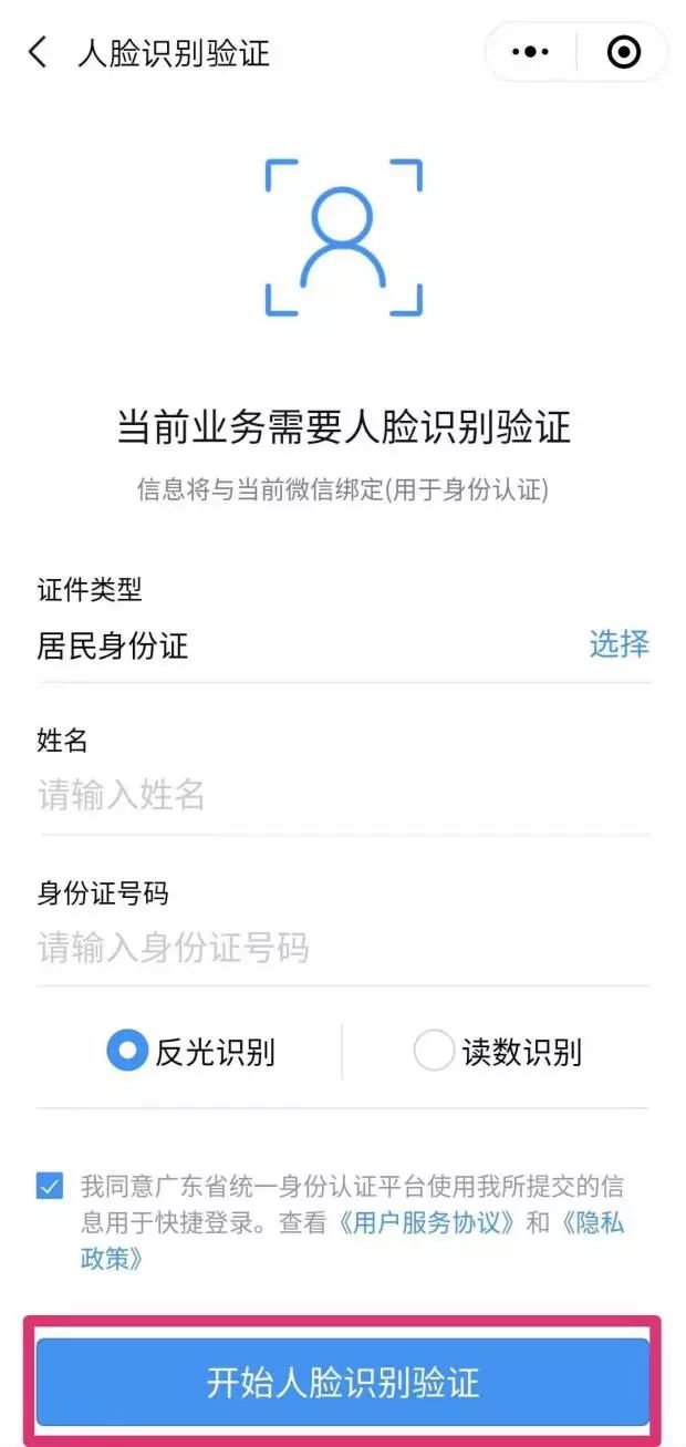②按系统提示,输入姓名和身份证件信息,人脸识别验证成功后,点击【返回粤商通】
