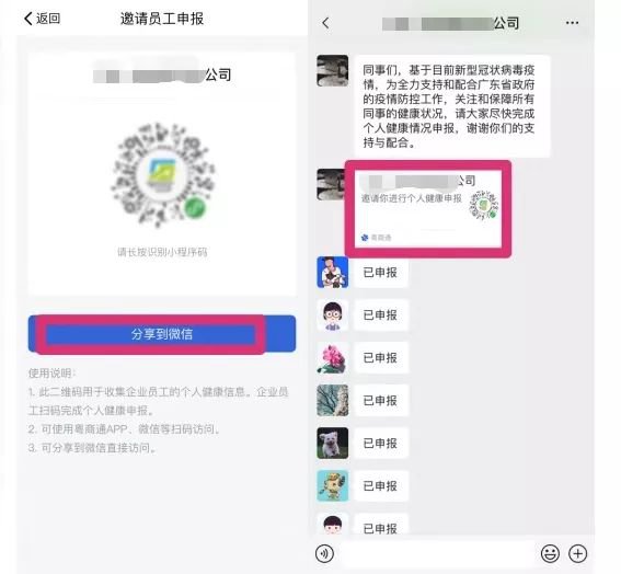 ②打开【邀请员工申报】页后,展示企业专属申报二维码。点击【分享到微信】向员工发送申报链接。