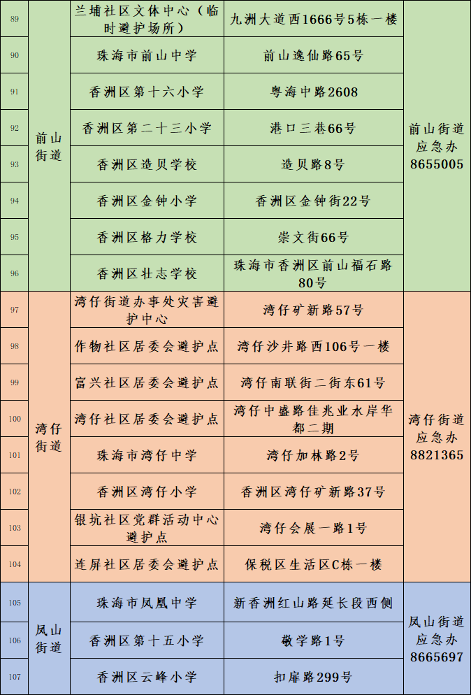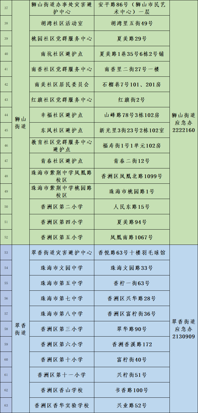 珠海香洲区室内自然灾害应急避难场所信息表