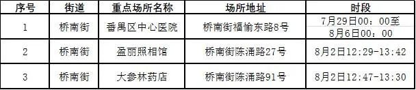 到过番禺区中心医院、桥南街陈涌路盈丽照相馆、桥南街陈涌路大参林药店等重点场所的人员请立即报备并核酸检测。
