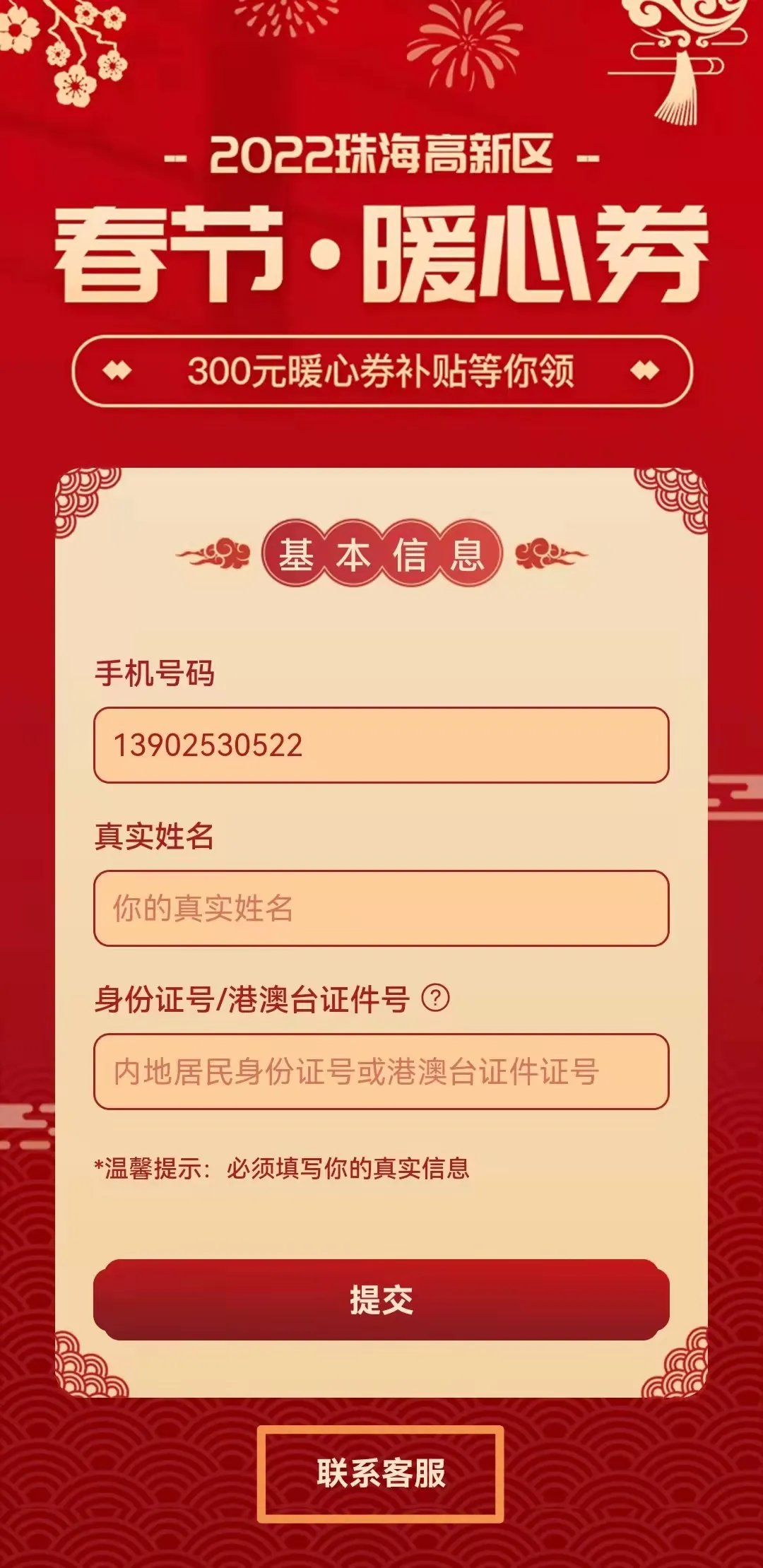 页面申请成功后若收到“暖心券”未发放成功的短信通知,请稍后通过“珠海高新区”微信公众号的“暖心券”—“个人申领”进入活动页面,再次填写申请。