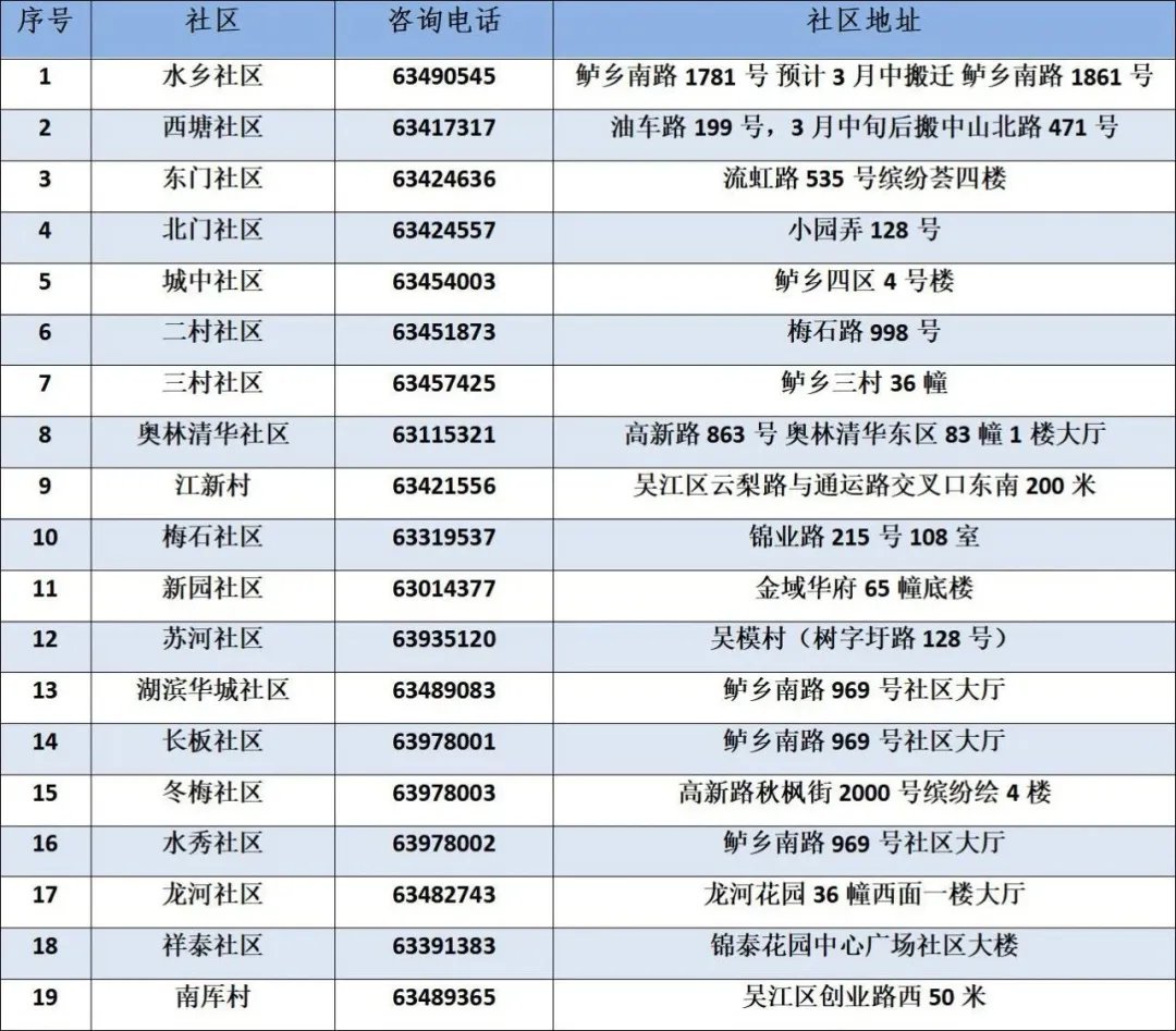 苏州永鼎医院预防接种门诊、松陵卫生院流虹路接种门诊、松陵卫生院体育路预防接种门诊、八坼社区卫生服务中心、菀坪卫生院、横扇卫生院