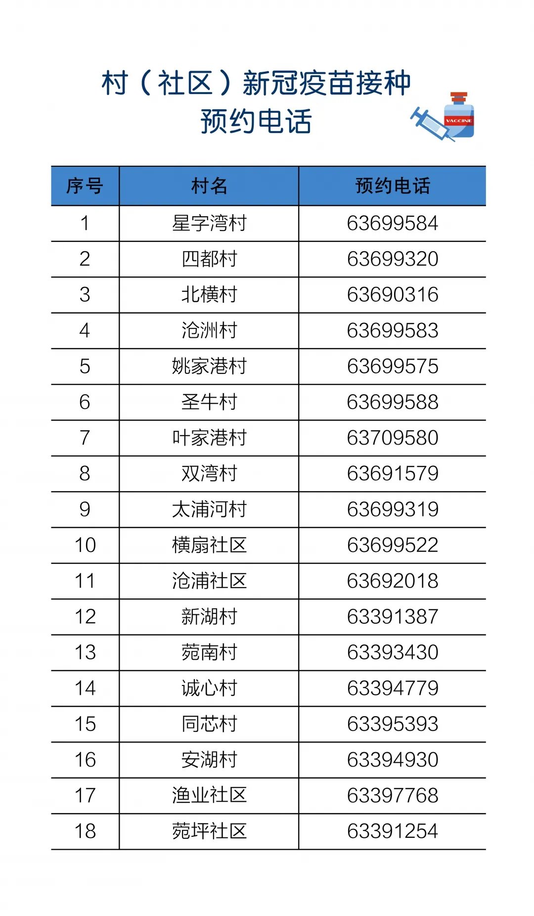 东太湖度假区(太湖新城)各村(社区)新冠病毒疫苗接种预约电话