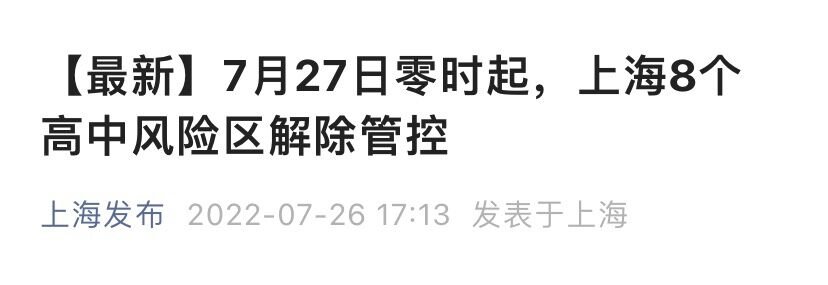 上海市新冠肺炎疫情防控工作领导小组办公室发布消息:根据第九版《新型冠状病毒肺炎防控方案》相关规定,经市新冠肺炎疫情防控工作领导小组办公室研究决定,自2022年7月27日零时起,将以下8个高、中风险区解除管控: