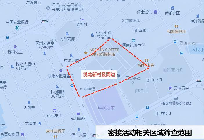 | 2022年5月24日 | 5月23日接报,外市新冠肺炎病例的密切接触者居住在新会区会城街道悦龙新村。该密切接触者5月21日在外省接触病例,5月21日晚返回我区后,主要在悦龙新村附近活动。新会区新冠肺炎疫情防控指挥部迅速部署,立即启动应急处置机制,目前密切接触者已接受集中隔离医学观察。 | ![]() | 5月24日13:00至16:00前往悦龙新村小公园(临时采样点)进行核酸采样,设2条采样道。 | 点击查看 |