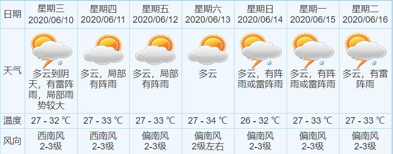 10日有雷阵雨,局部雨势较大;11-13日以多云为主,间中有阵雨,天气渐趋炎热;14-16日多阵雨或雷阵雨。