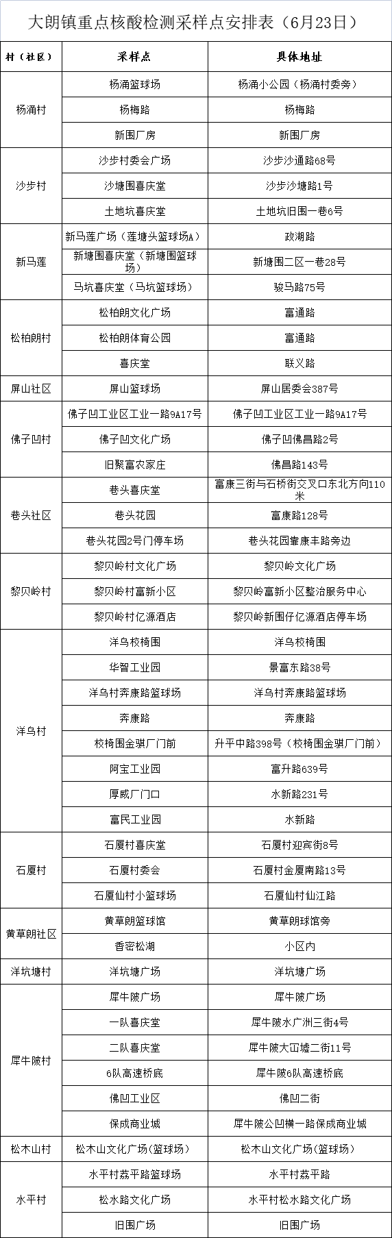 6月23日,大朗镇开展免费核酸抽检的村(社区)有杨涌、沙步、新马莲、松柏朗、屏山、佛子凹、巷头、黎贝岭、洋乌、石厦、黄草朗、洋坑塘、犀牛陂、松木山、水平,抽检时间为12:00-20:00,采样点设置如下(具体核酸采样点会根据现场实际调整,请以村、社区通知为准):