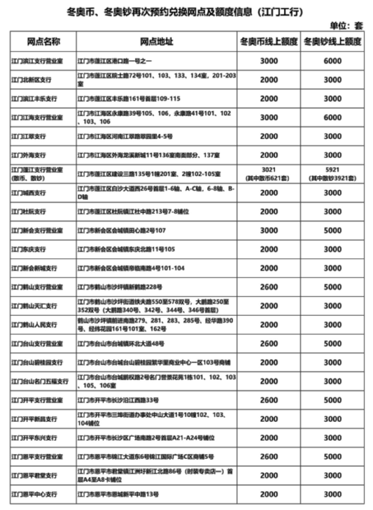 江门工行额度冬奥币54421套,冬奥钞为90921套。(预约网点及额度信息详见附表)