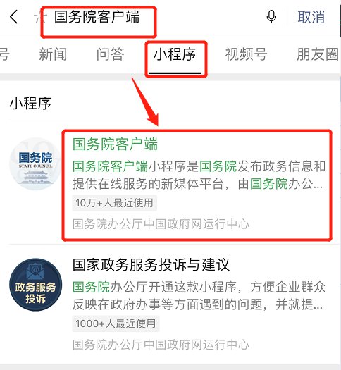 1、微信搜索“国务院客户端”小程序;