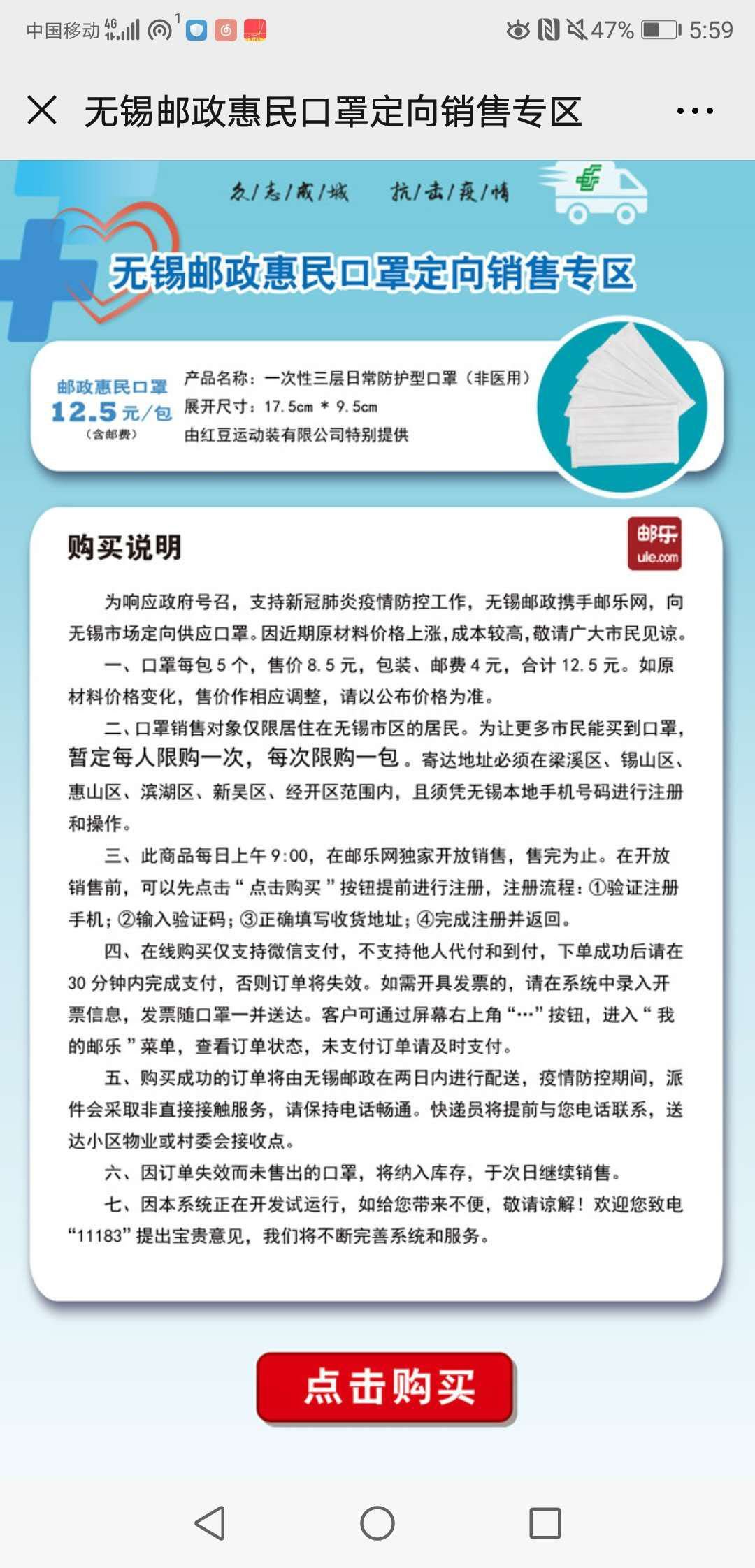 二、口罩销售对象仅限居住在无锡市区的居民。为让更多市民能买到口罩,暂定每人限购一次,每次限购一包。寄达地址必须在梁溪区、锡山区、惠山区、滨湖区、新吴区、经开区范围内,且须凭无锡本地手机号码进行注册和操作。