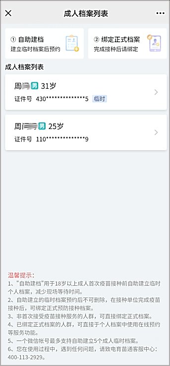 2、自助建立的临时档案预约后不可删除,在接种单位完成疫苗接种后,可绑定正式预防接种档案。