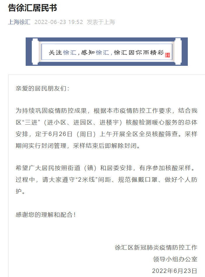 徐汇区全员核酸通知(更新时间:2022年6月24日)