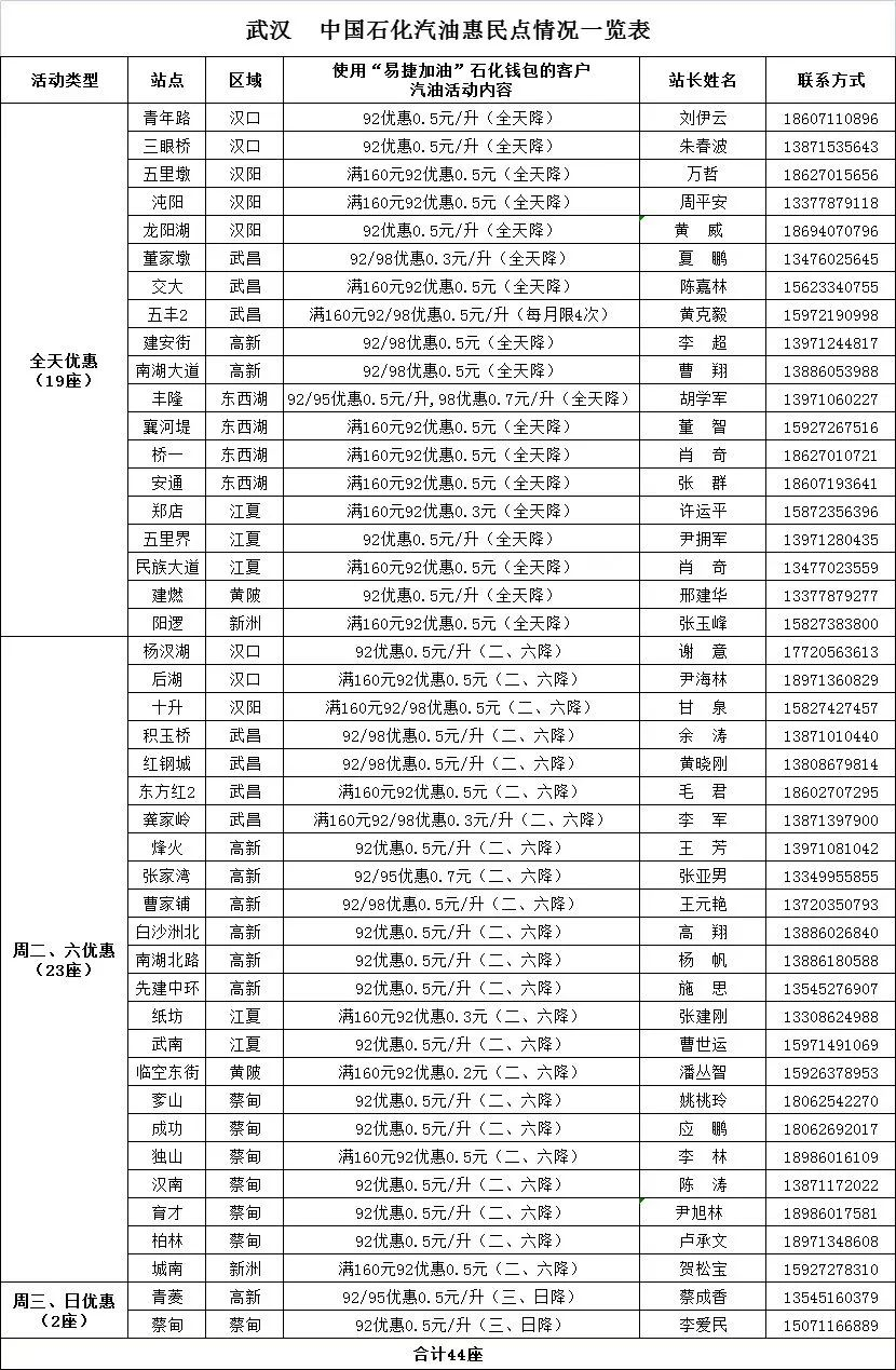 即日起,湖北中石化公司在武汉市44座加油站开展汽油消费惠民活动,其中19座加油站开展汽油全天优惠,23座加油站周二、周六开展汽油优惠,2座加油站周三、周日开展汽油优惠。凡使用“易捷加油”的客户汽油最高可享7角/升优惠。