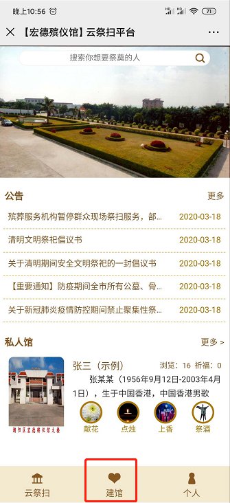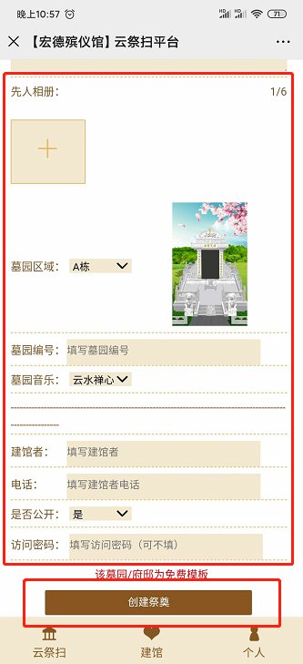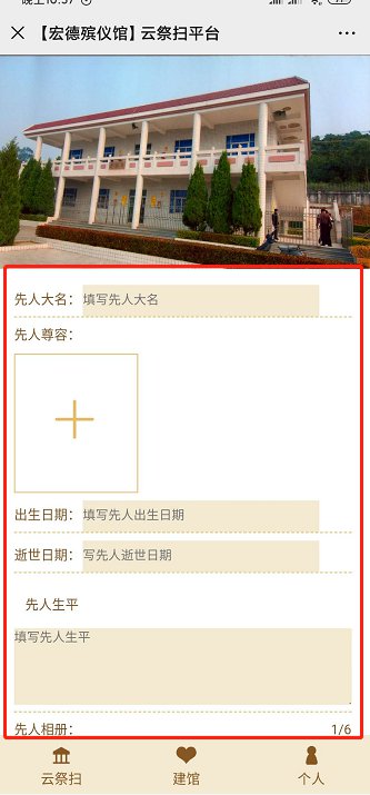 3、建设基础信息。包括先人名称、上传尊容图片、出生与逝世日期、生平简介、相册多图、墓域、编号(即行和号)、背景音乐、建馆者姓名、电话号码、是否公开(是则所有人可见)、访问密码(增加安全性)。