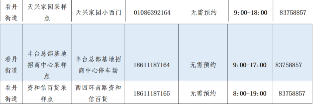 ➤北京丰台看丹街道常态化核酸检测点【因各采样点会有动态调整变化,具体实际情况为准】