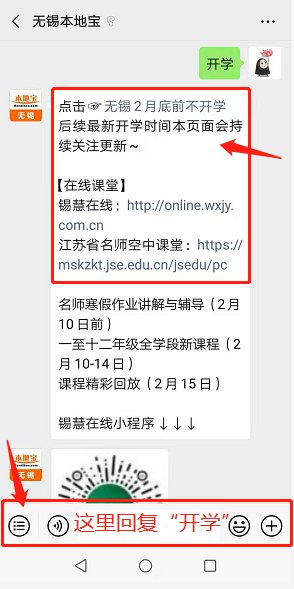开学最新消息:微信搜索公众号“无锡本地宝”,在公众号聊天框回复“开学”,即可查询无锡开学最新消息,进入“锡慧在线”、“梁溪名师在线”课堂,课表、电子课本等;回复“口罩”,即可进入口罩预约入口,查询预约流程;回复“锡康码”,进入锡康码申请入口,查询申请流程等!