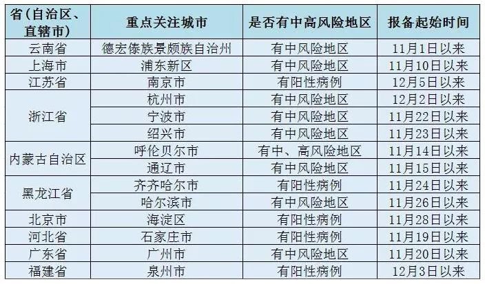 中高风险地区或有感染者报告的城市(截至12月9日)