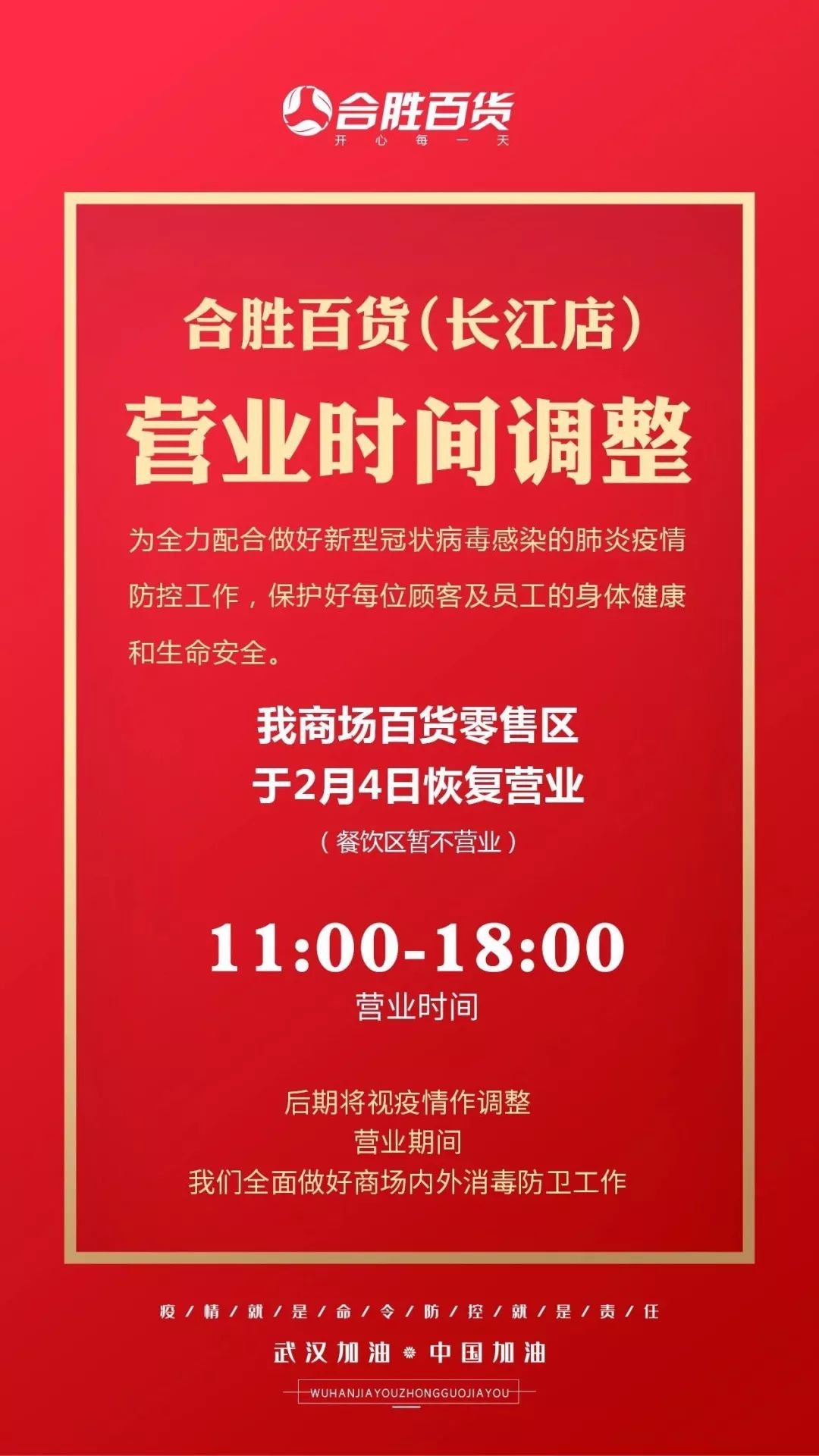 合胜百货(长江店):营业时间调整为11:00 - 18:00,餐饮区暂不恢复营业