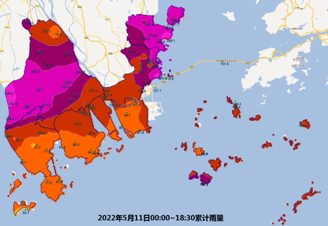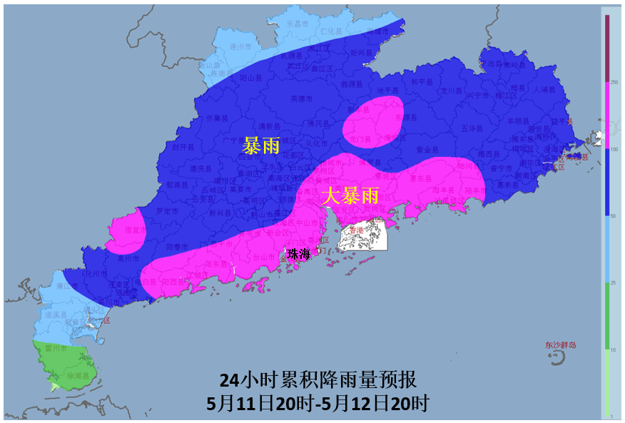 受强盛西南季风影响,5月11日00:00~18:30全市普降暴雨到大暴雨。 其中斗门西部、香洲和高新沿海更是出现特大暴雨 最大雨量出现在情侣北路,355.4毫米。