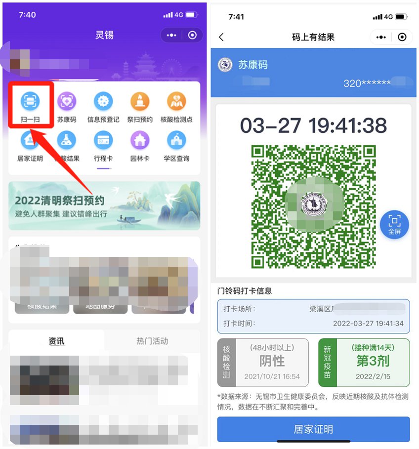 在进入公共场所前,打开“灵锡”APP,首页点击“扫一扫”,扫描“门铃码”后进入该场所。