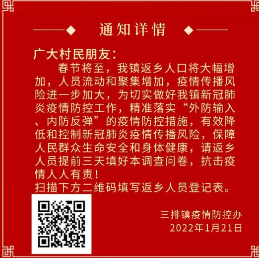 请各位民众抵达连南前主动查验自身健康码,如显示为黄码和红码人员,请尽快与各镇“三人小组”(详细联系电话附后)联系,并配合防疫人员完成信息核实和下一步健康管理。
