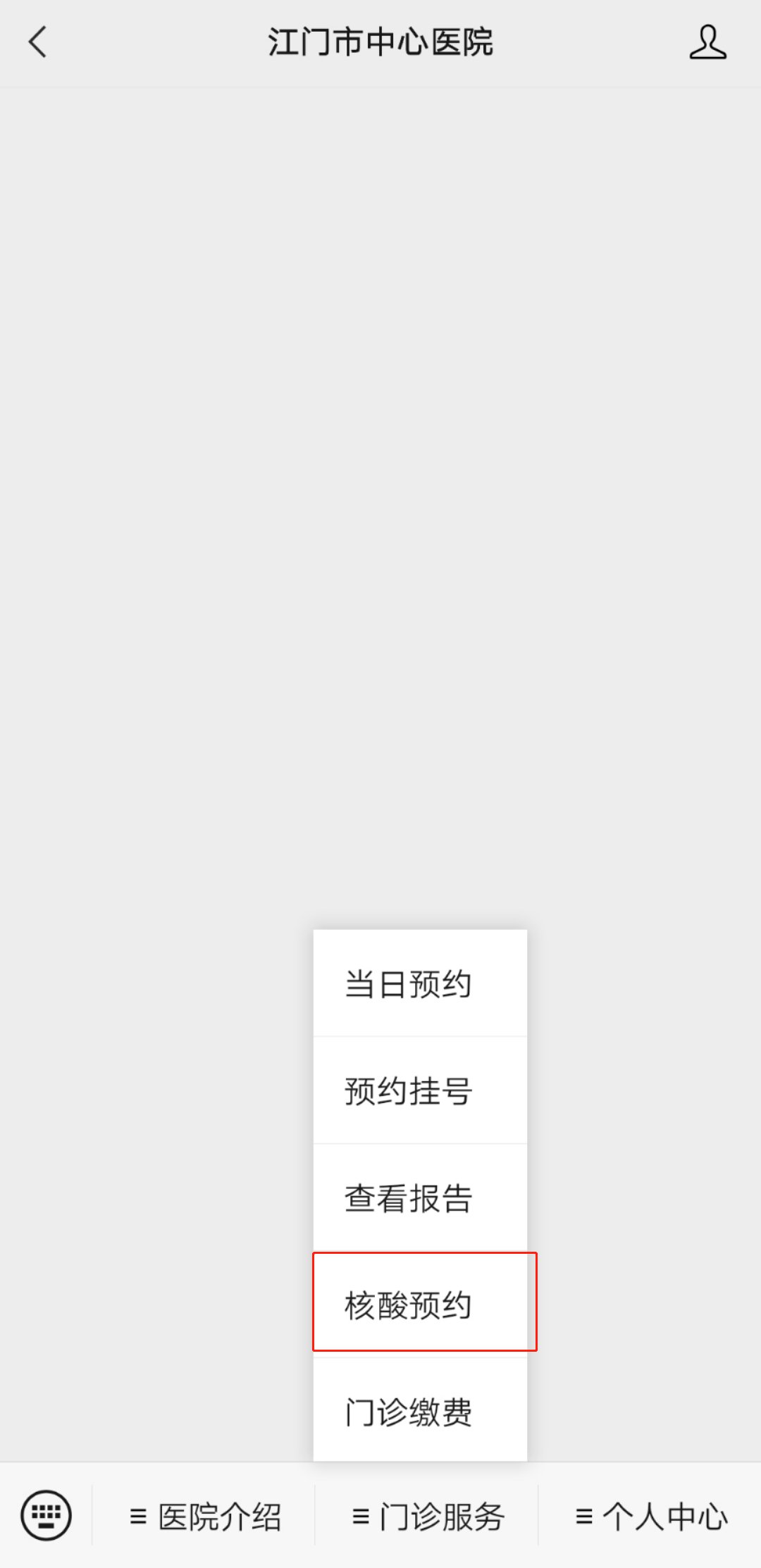 预约步骤:第一步:进入【江门市中心医院】微信平台,查看菜单栏;