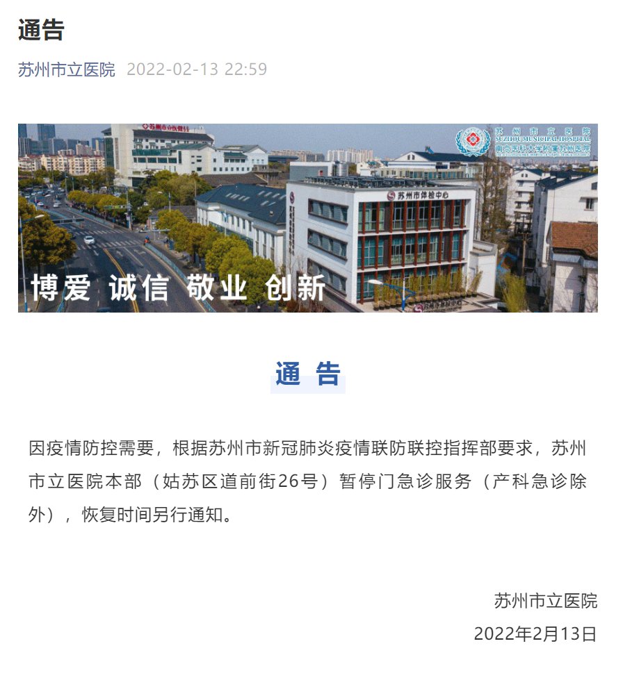 因疫情防控需要,根据苏州市新冠肺炎疫情联防联控指挥部要求,苏州市立医院本部(姑苏区道前街26号)暂停门急诊服务(产科急诊除外),恢复时间另行通知。