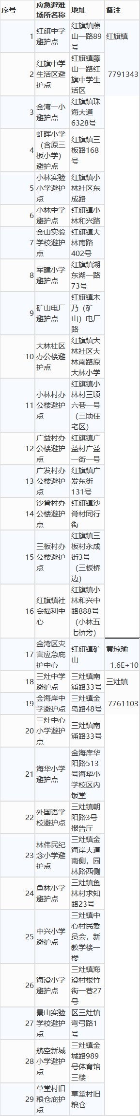 金湾区已经开放29个应急避难场所