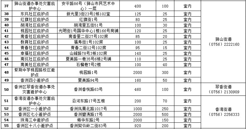 【香洲区自然灾害应急救助庇护场所信息】