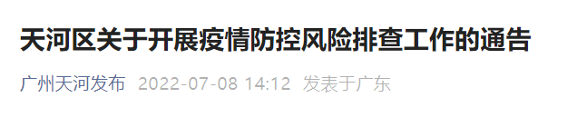 广州天河发布《天河区关于开展疫情防控风险排查工作的通告》,根据疫情防控需要,经区新型冠状病毒肺炎疫情防控指挥部研究决定,对天河南街道华翰大厦实施临时封控管理,并于2022年7月8日15时起在天河南街道开展全员核酸筛查工作。