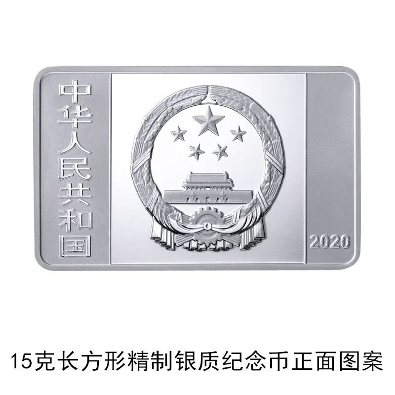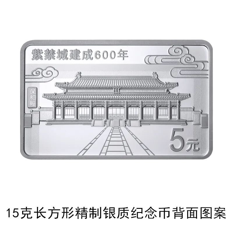 15克长方形银质纪念币背面图案为保和殿建筑造型,辅以祥云及台基等组合设计。