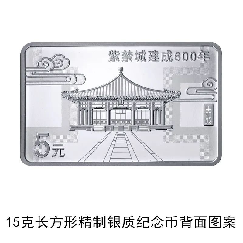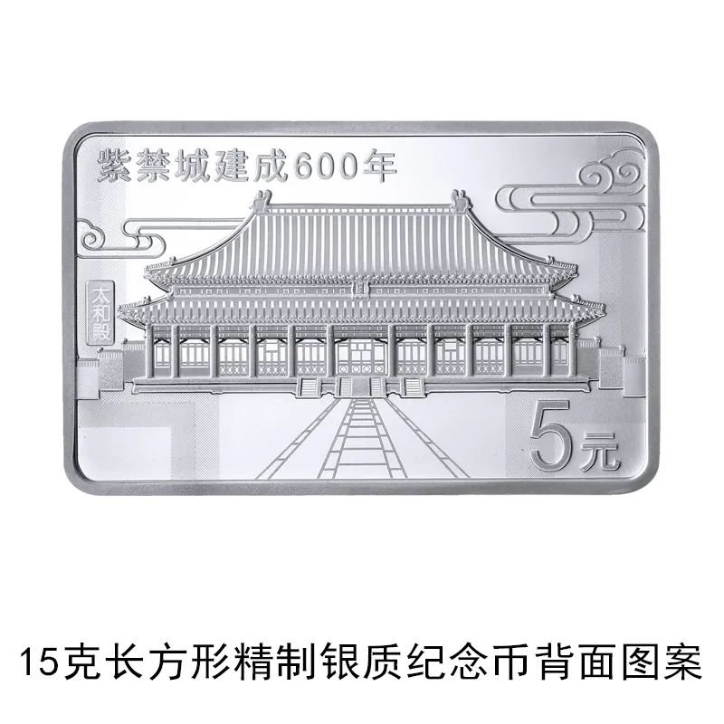 15克长方形银质纪念币背面图案为太和殿建筑造型,辅以祥云及台基等组合设计。