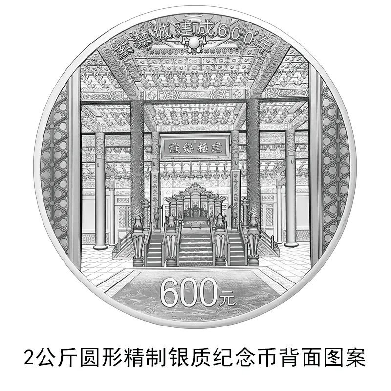 2公斤圆形银质纪念币背面图案为太和殿内景,辅以装饰图案组合设计。