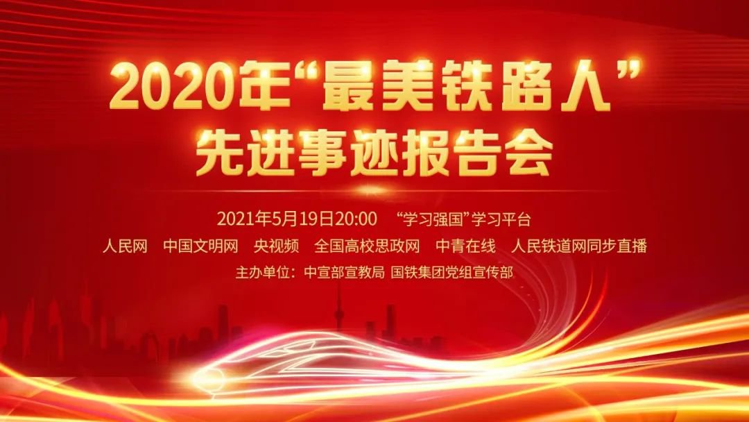 2020年“最美铁路人”先进事迹报告会由中宣部宣教局与国铁集团宣传部联合主办,将于5月19日20:00在“学习强国”学习平台“实播中国”频道进行直播,届时10位先进个人和1个先进集体将会在线上与大家分享他们的奋斗故事,欢迎收看。