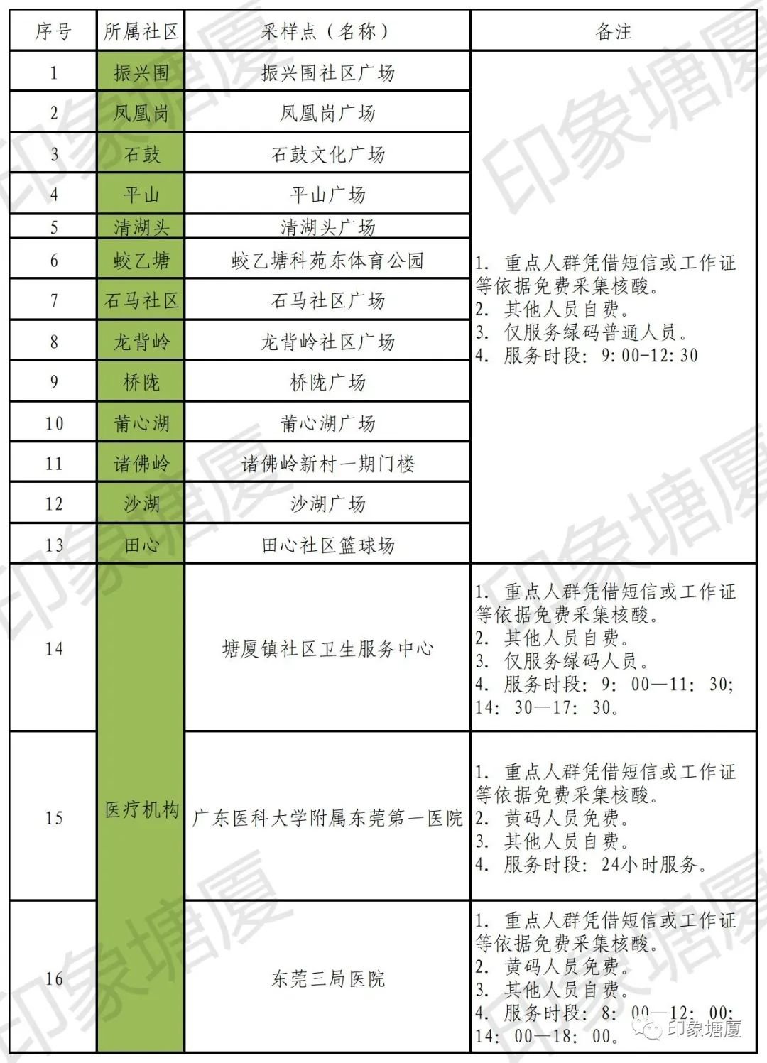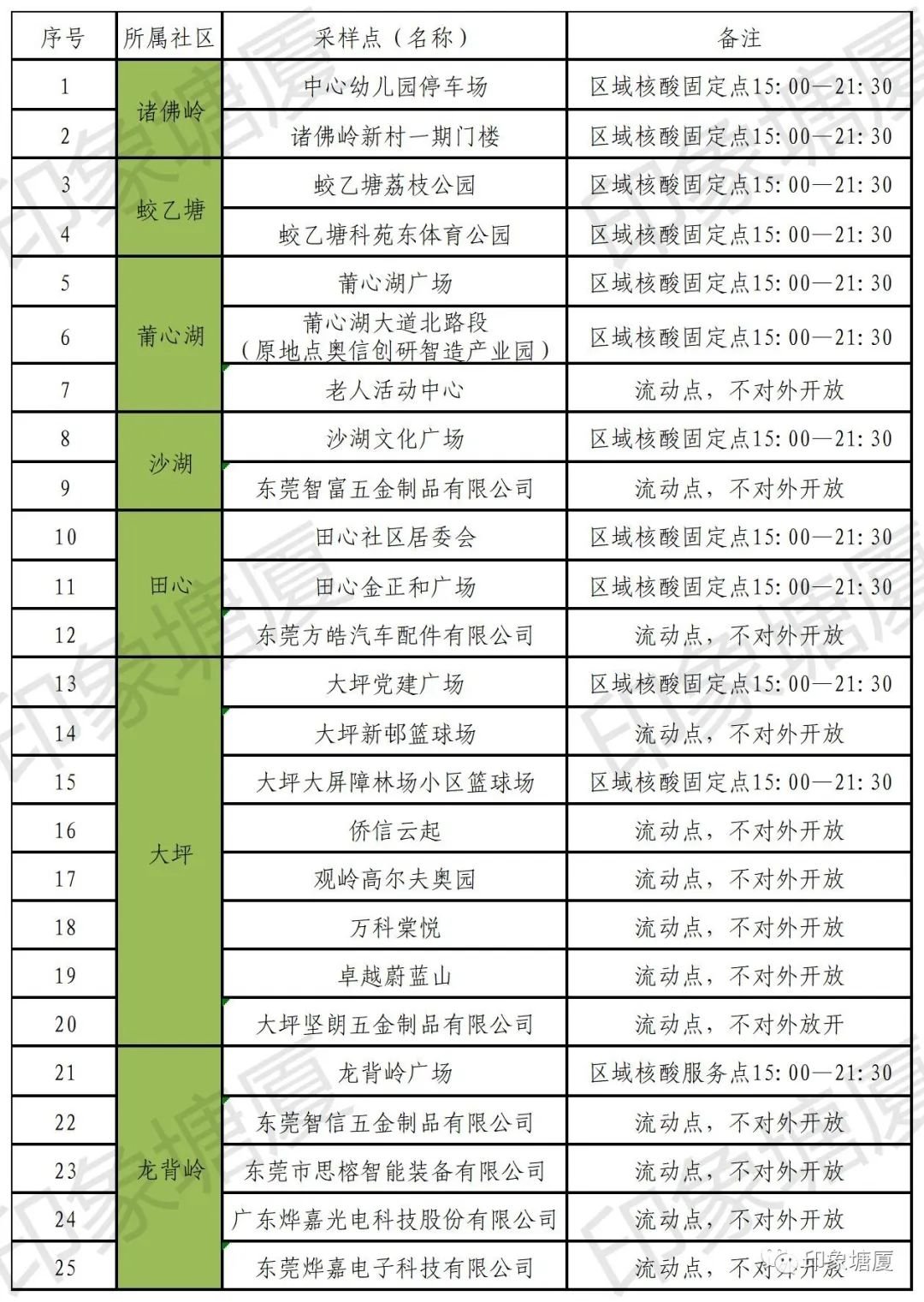 请以上属地社区辖区范围内户籍人口、常住人口、来(返)塘厦人员积极参与核酸,其他社区市民群众也可以跨区参与核酸检测,坚持应检必检、不漏一户、不落一人。