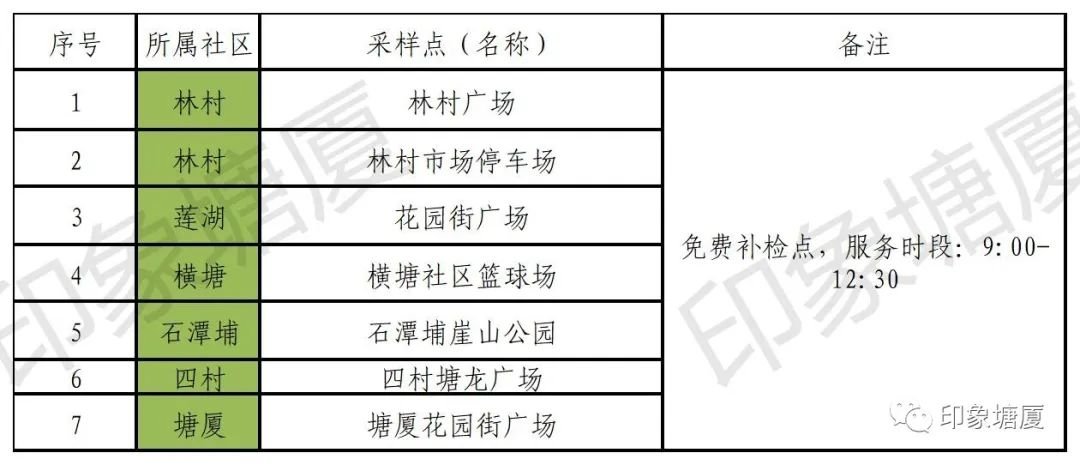 其中:林村社区、莲湖社区、塘厦社区、横塘社区、石潭埔社区、四村社区共6个社区的便民核酸点可以进行免费核酸补检,请以上属地社区未参与6月26日区域核酸检测的群众务必到补检点完成核酸检测。