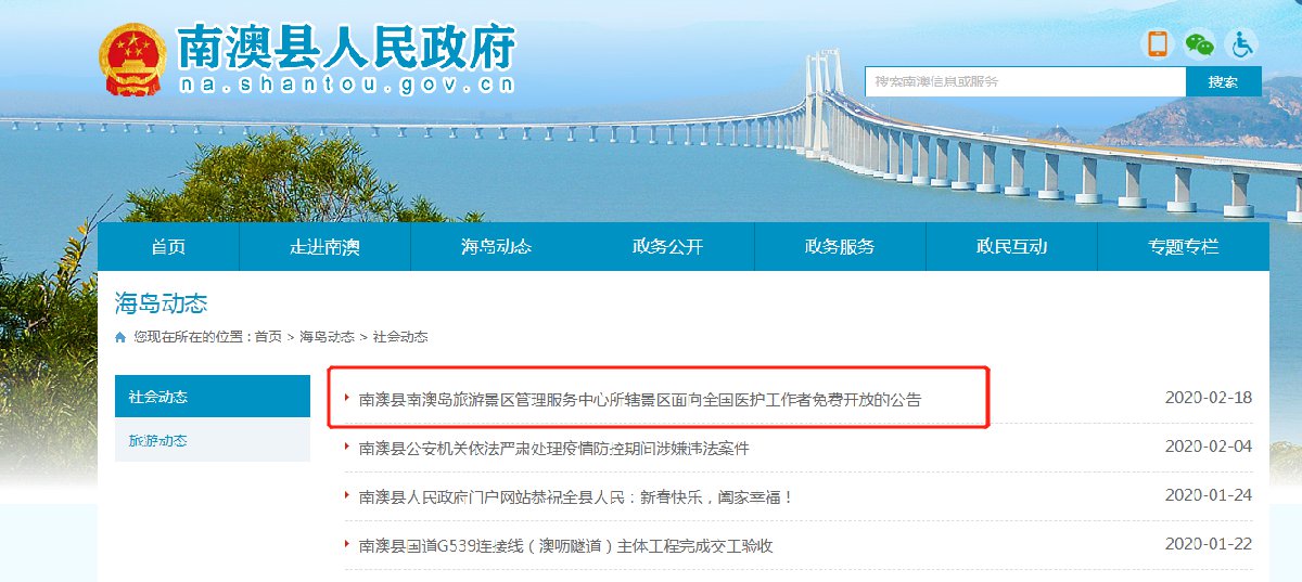 南澳县宋井景区、总兵府景区、金银岛景区自恢复开放之日起至2020年12月31日。向全国医护工作者免费开放。