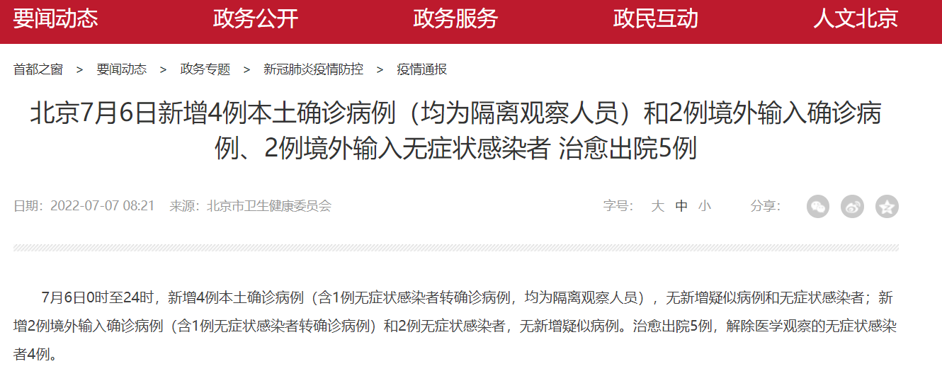 7月6日北京新增4例本土确诊病例(均为隔离观察人员)