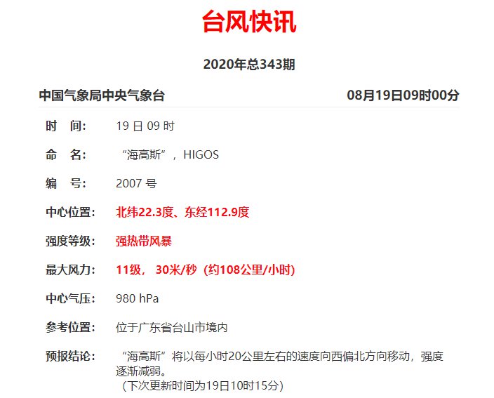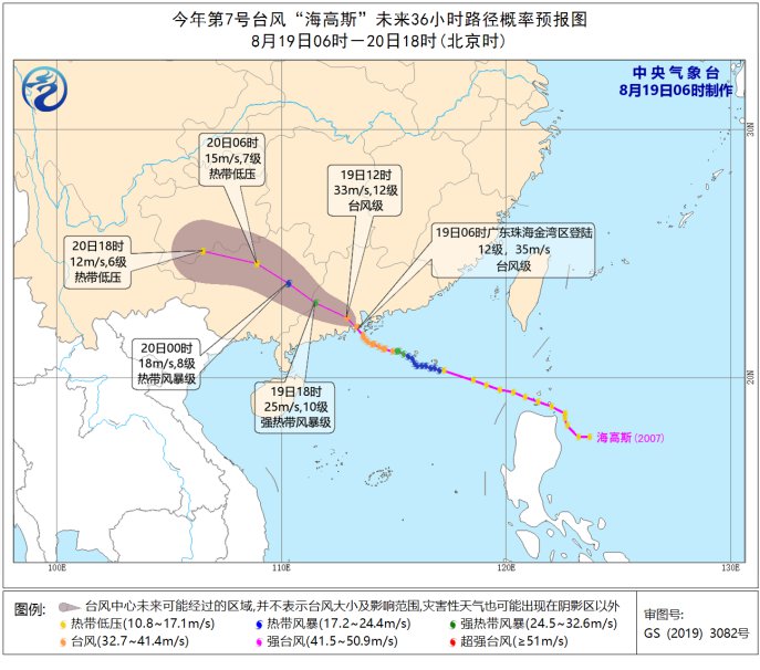 今年第7号台风“海高斯”已于今天(19日)早晨6点钟前后在广东省珠海市金湾区沿海登陆,登陆时中心附近最大风力有12级(35米/秒),最低气压为970百帕,其中心位于北纬22.1度、东经113.3度,七级风圈半径150-200公里,十级风圈半径40公里,十二级风圈半径20公里。