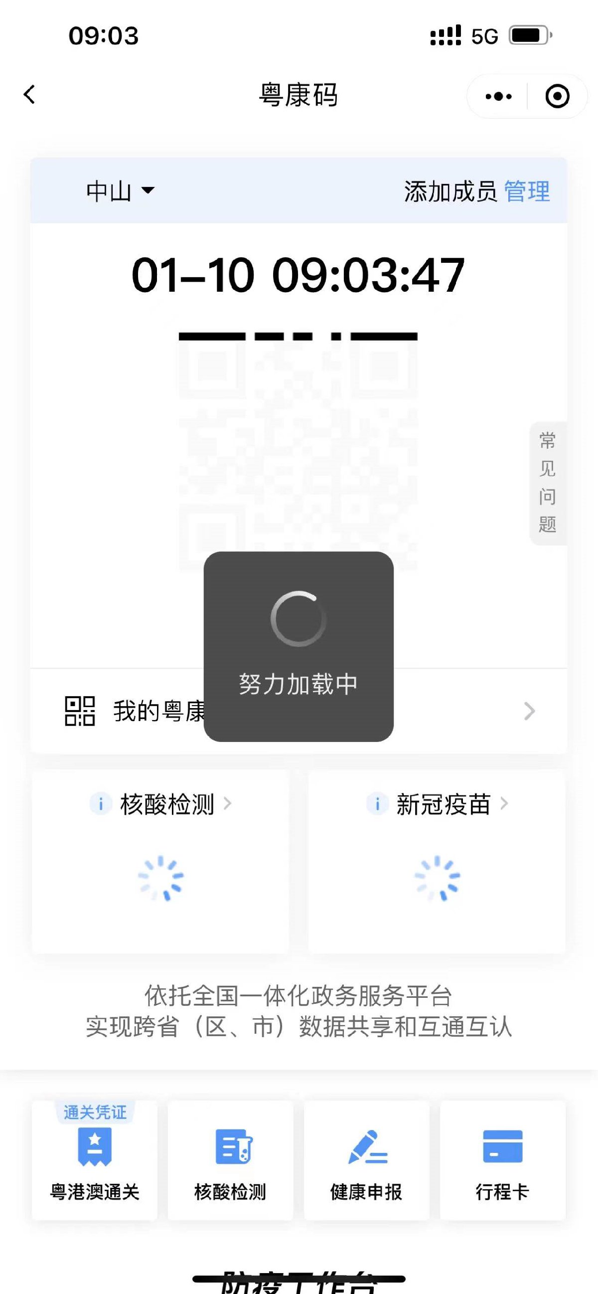 粤康码一直“努力加载中”,但就是没有加载完显示,因为是系统原因导致的,建议稍后再试!