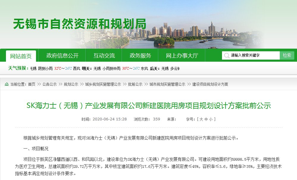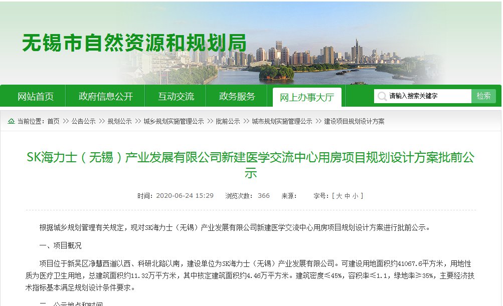 无锡市自然资源和规划局网站公布了,SK海力士(无锡)产业发展有限公司新建医院用房项目规划设计方案批前公示和新建医学交流中心用房项目规划设计方案批前公示。