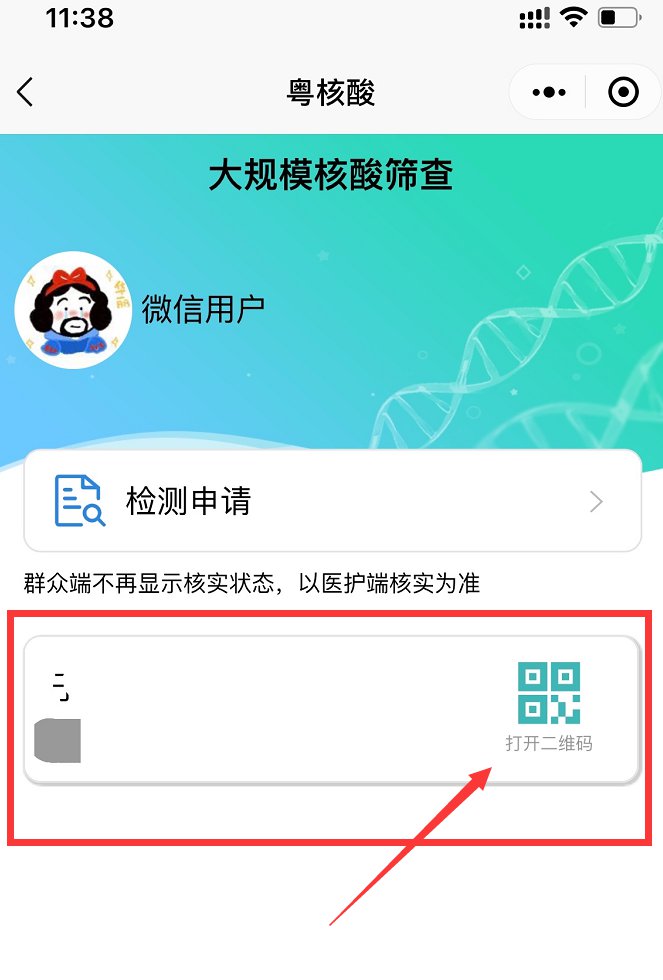 向信息登记处人员出示已截图的二维码;如无截图可重新扫“粤核酸4”二维码则可显示个人信息二维码,经现场信息登记处的人核实信息后显示如下图即可进入采样工作台采样。