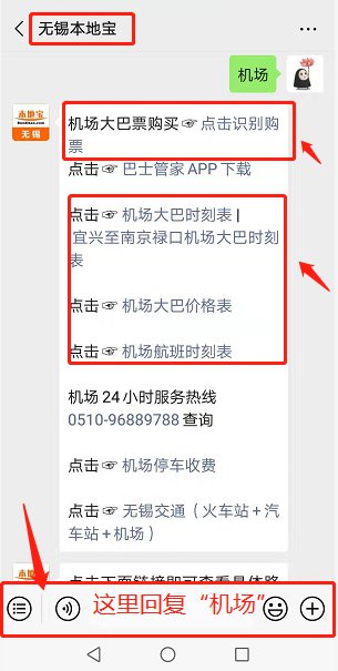 温馨提示:微信搜索公众号“无锡本地宝”,在聊天框发送关键词“机场”即可购买大巴车票、查询机场大巴时刻表,还有实时航显,航班查询,微信买票更方便快捷。
