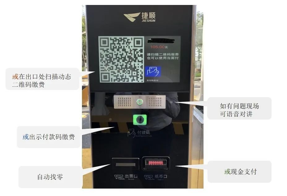 可在场内自助扫码缴费,或在出口无人值守一体机上扫描动态二维码,或出示付款码进行缴费,在手机上即可开取电子发票。