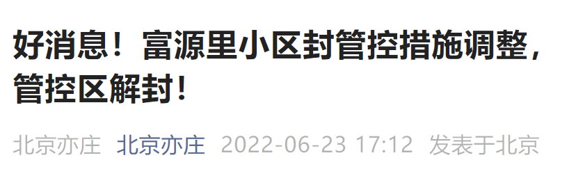 自2022年6月23日起,管控区富源里小区16、18号楼以外其他楼栋解除管控措施,解除管控区域人员仍需开展健康监测4天,除进行常态化核酸检测外,于第4天进行核酸检测。