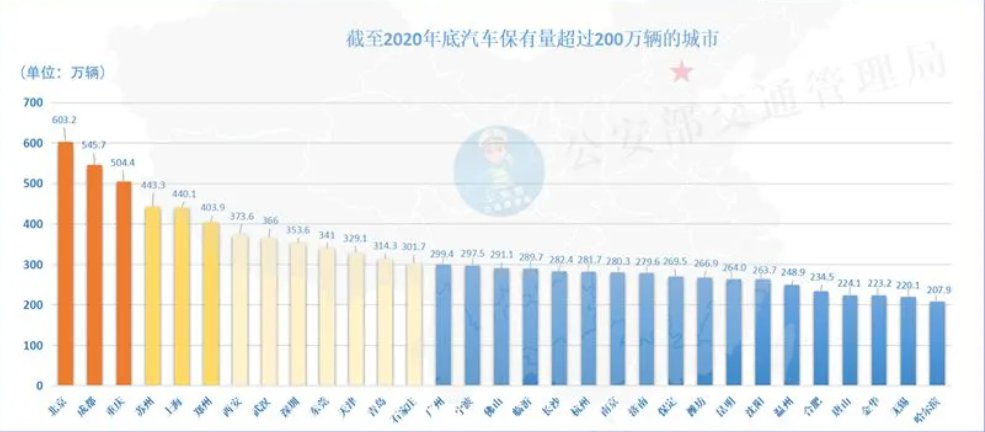 2021年1月7日,公安部公布2020年全国机动车和驾驶人数据,全国有70个城市的汽车保有量超过百万辆,同比增加4个城市,31个城市超200万辆,13个城市超300万辆,其中北京、成都、重庆超过500万辆,苏州、上海、郑州超过400万辆,西安、i武汉、深圳、东莞、天津、青岛、石家庄等7个城市超过300万辆。